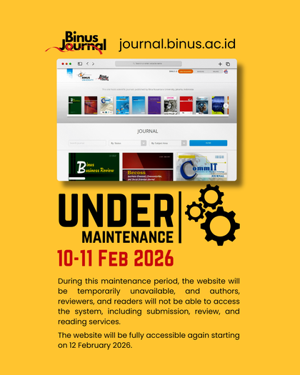 Please be informed that the BINUS Journal system will be under maintenance on 10–11 February 2026. Access to the website, including manuscript submission, peer review, and reading services, will be temporarily unavailable.