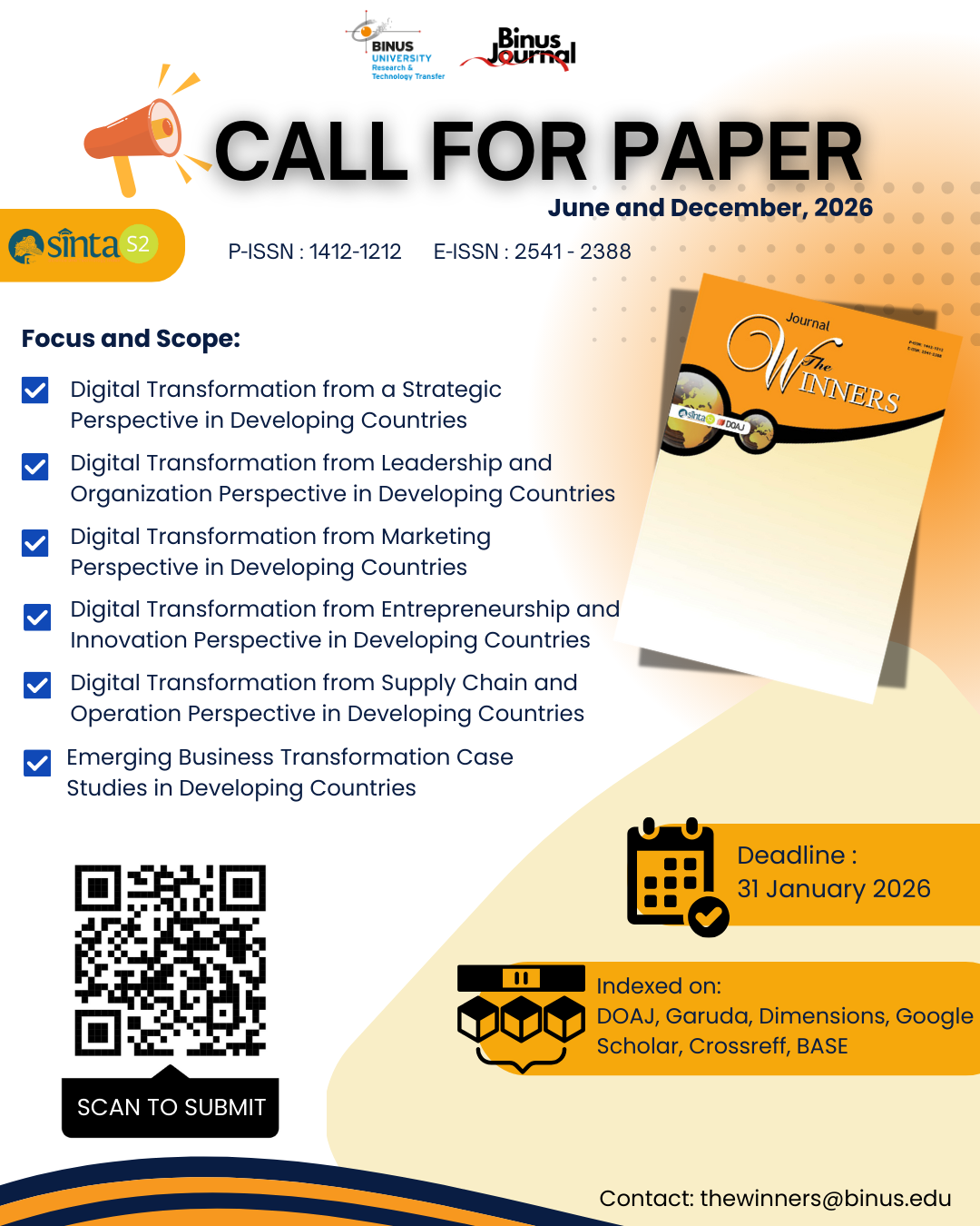 Journal The Winners is a semiannual journal published in June and December, published by The Research and Technology Transfer Office (RTTO) of Universitas Bina Nusantara, Binus Business School Master Program, and Binus Business School Doctoral Program. Our journal collaborates with Forum Manajemen Indonesia (FMI). Journal The Winners focus on various issues spanning the study of Digital Transformation in developing countries from strategic, leadership and organization, marketing, entrepreneurship and innovation, supply chain, and operation perspectives.